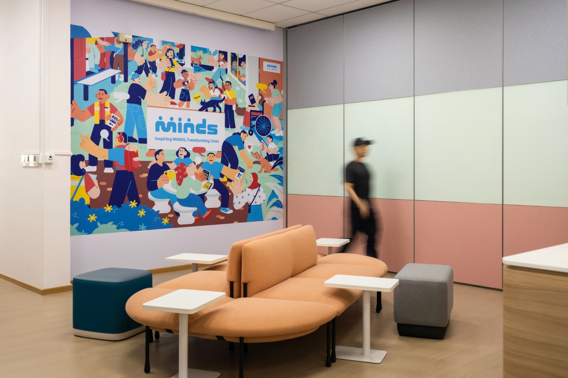 The MINDS office in Singapore was designed to foster peace and comfort. In today’s fast-paced work culture, spatial calm is a strategic advantage. This design puts people at its center, using soft, rounded forms and a muted, neutral palette to create a sense of ease throughout the space.