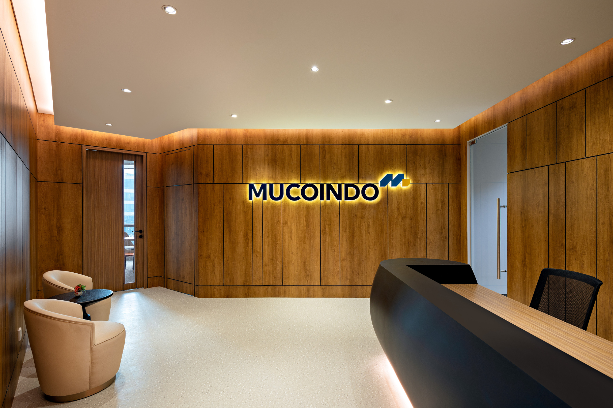 The design embraces a clean, warm, and timeless aesthetic, reflecting a company built to last. An earthy, natural color palette sets the tone, with dark woodgrain laminates paired with grey carpets, evoking a sense of comfort, professionalism, and grounded strength. The contrast of these warm textures with sleek, clean lines strikes a harmonious balance between rugged durability and sophisticated style, perfectly mirroring Mucoindo’s values.