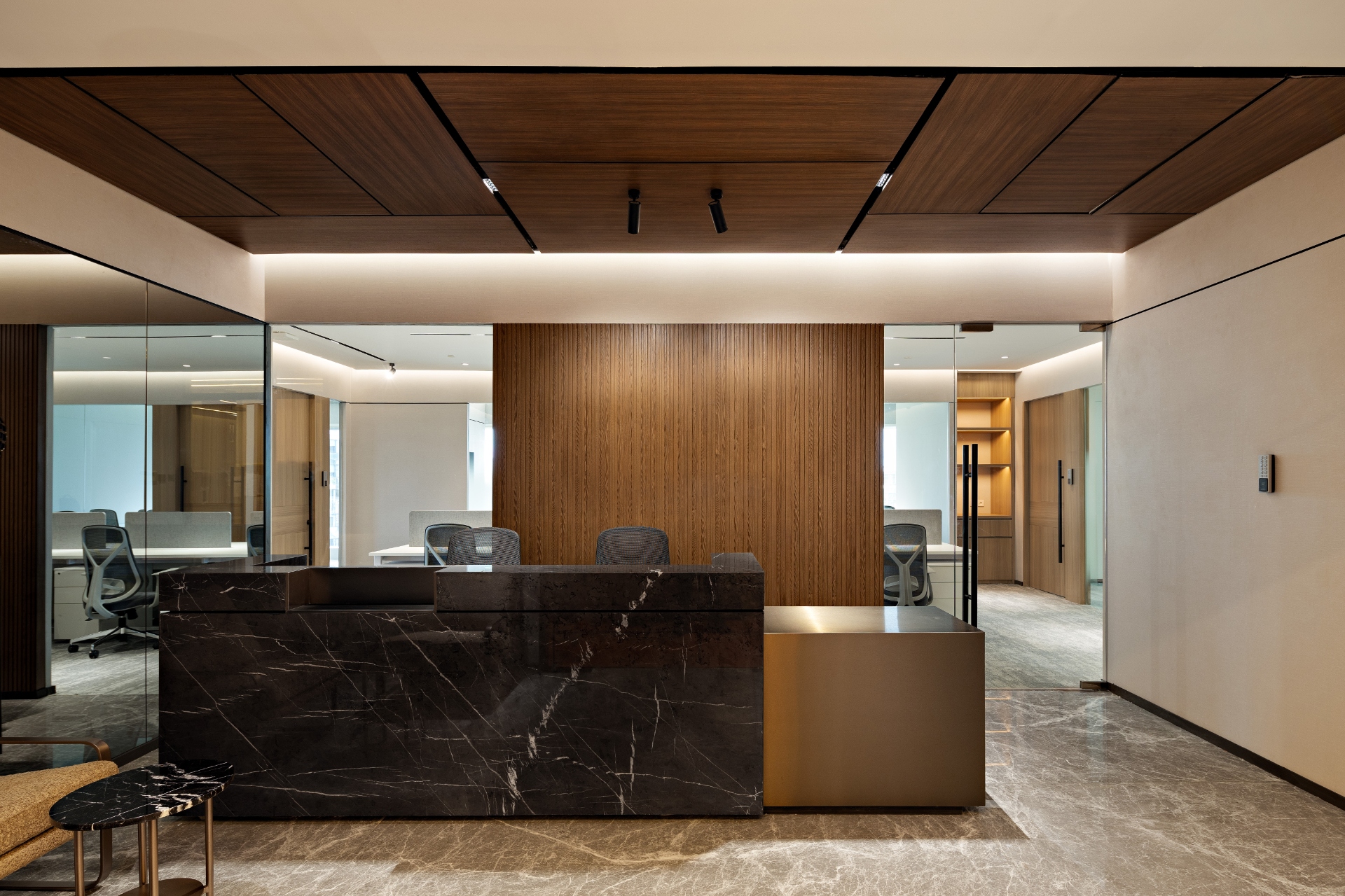 This refined workspace embodies sophistication and purpose. Designed to foster productivity and elegance, the space is anchored by rich brown wood and marble accents, exuding timeless sophistication. Neutral hues flow throughout, creating a sense of calm, composure, and professionalism.